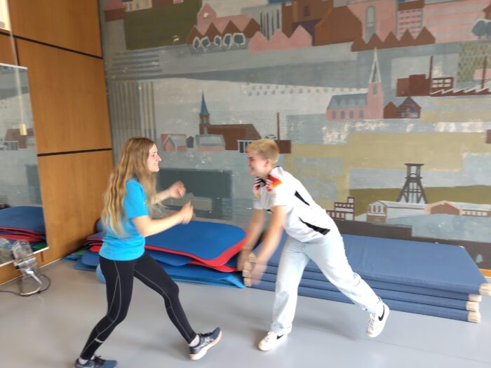 Wir haben dann circa zweieinhalb Stunden lang einen Crashkurs in Selbstverteidigung angelehnt an KRAV MAGA bekommen. Auch um zukünftig besser auf Anfeindungen und Gewalt während unseres politischen Engagement reagieren zu können war es uns ein besonderes Anliegen, diesen Kurs anzubieten.
